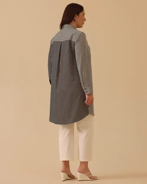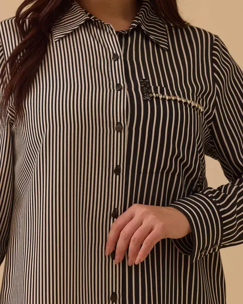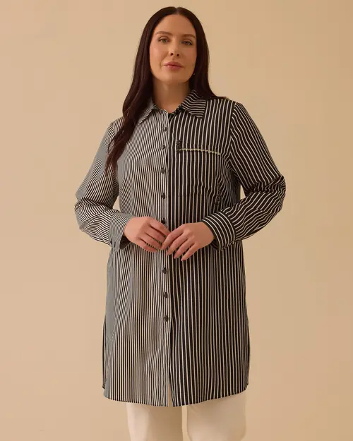 Büyük Beden Çizgili Taş Detaylı Tunik, zarif taş süslemeleri ve rahat kesimiyle şık bir görünüm sunar.