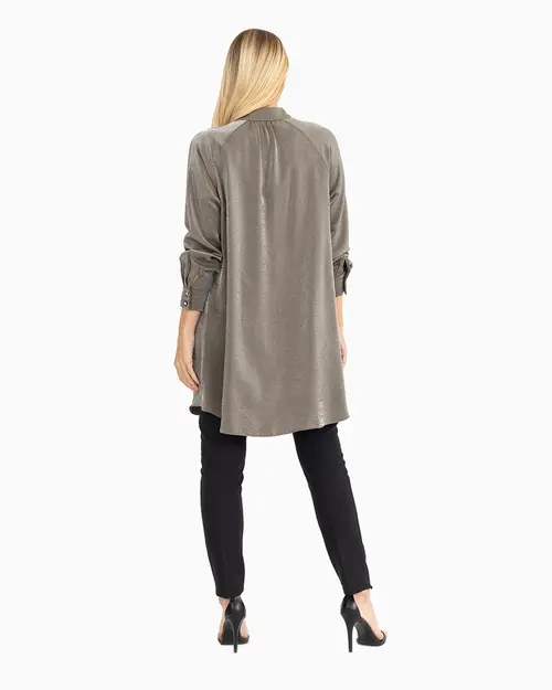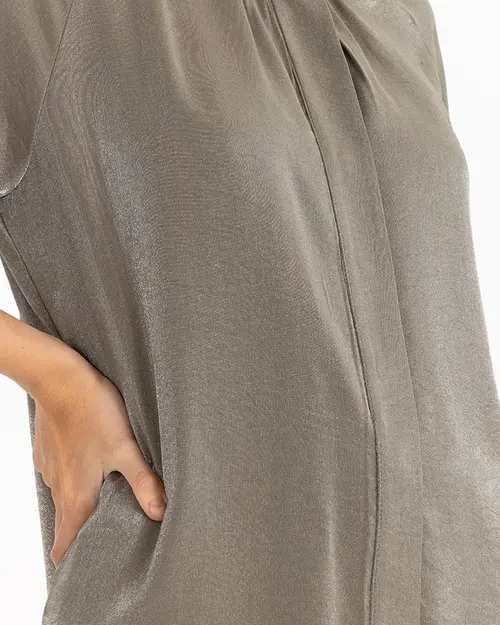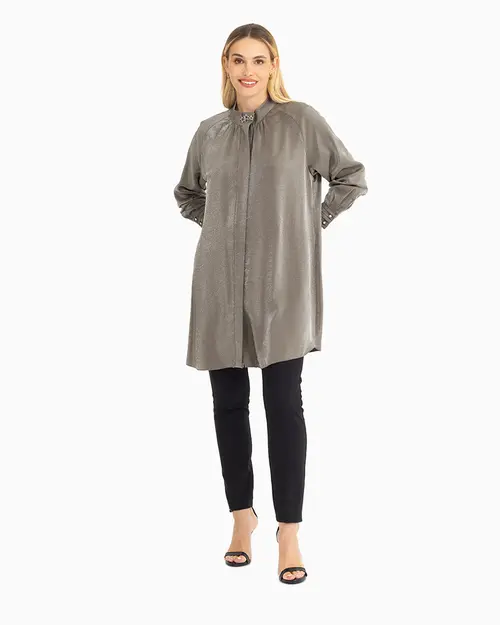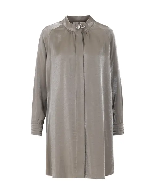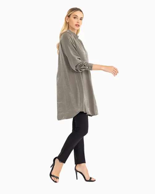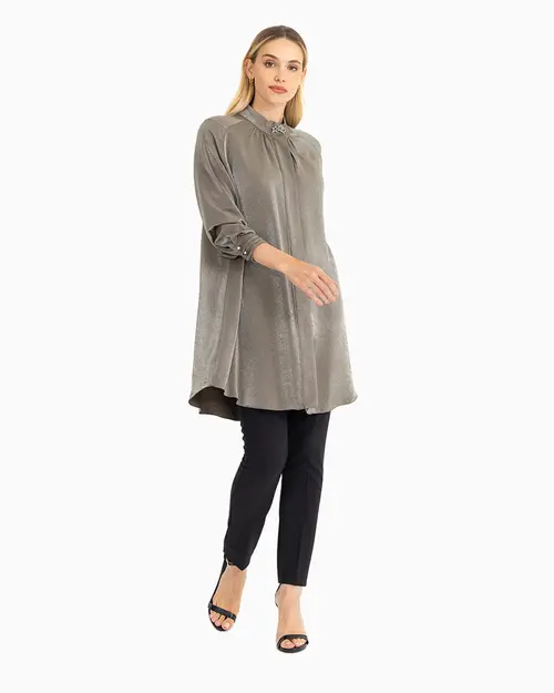 Yıldız aksesuarı ile dikkat çeken tunik, saten görünümü ile şıklığını katlıyor. Rahat kesimi ile konfor sunan tuniği, bol paça pantolonlar ile tamamlayabilirsiniz.