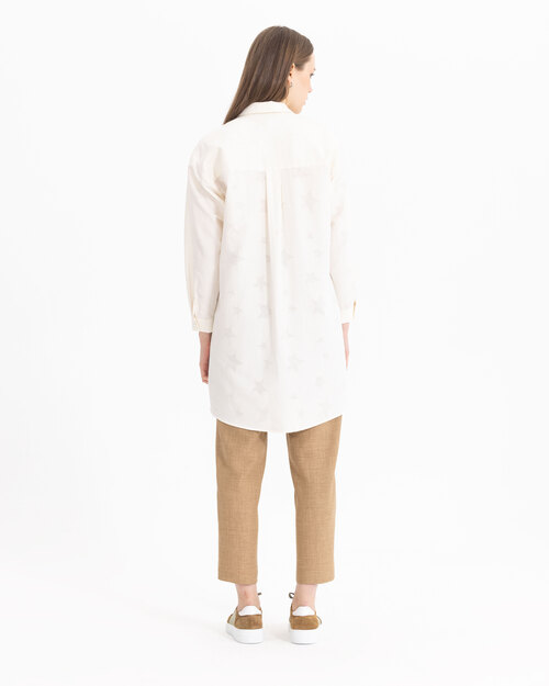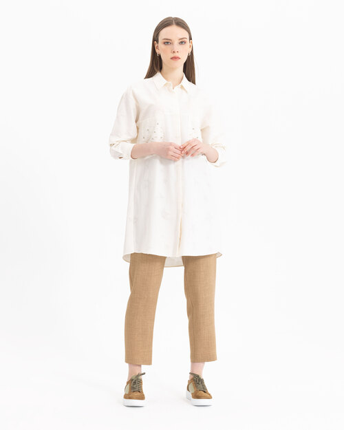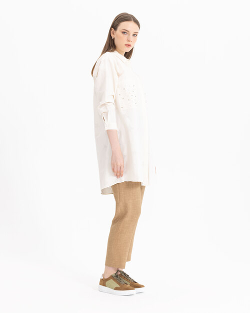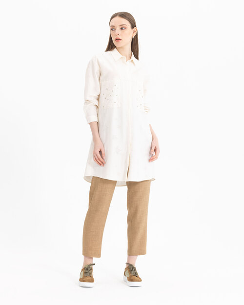 Ceplerine işlenen inci detayları ile dikkat çeken tunik, rahat kesimi ve ideal boyu ile konfor sunuyor. Tuniği, toprak tonlarında pantolonlar ile kombinlemeyi deneyebilirsiniz.