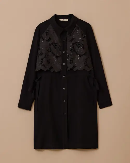 Dantel Garnili Beli Bağcıklı Cepli Tunik, üst kısmındaki zarif dantel detayı ve ayarlanabilir bağcıklı beliyle şık bir siluet sunar.