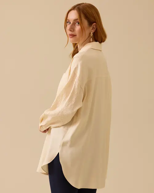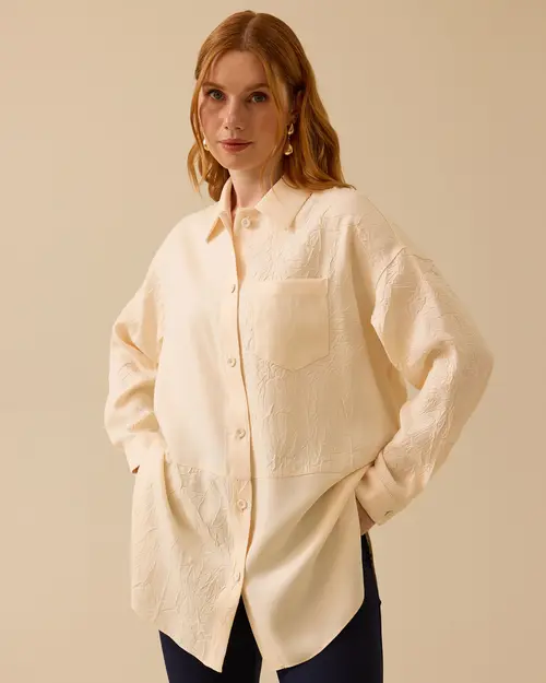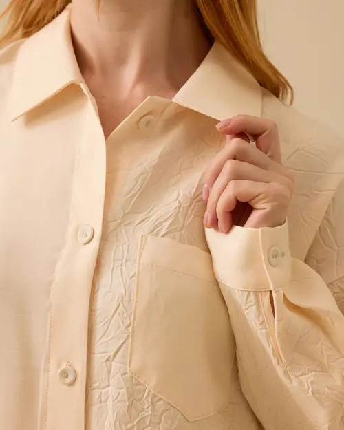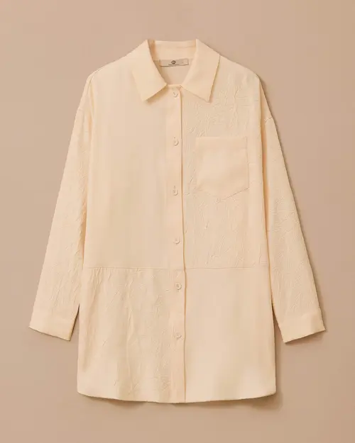 Dokulu Cep Detaylı Düğmeli Tunik, dokulu yüzeyiyle fark yaratır. Cep ve düğme detaylarıyla şıklığı tamamlar.