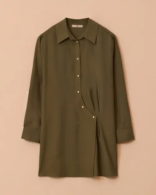 Düğme detaylı gömlek yaka tunik, rahat kesimiyle konfor sunar, zamansız duruşuyla günlük kullanıma uyum sağlar