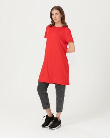 Basic formu ve kumaşı ile konfor sağlayan tunik, sıcak yaz günlerinde kurtarıcı parçanız olmaya hazır. Tuniği, mom kesin jean pantolonların üzerinde kombinleyebilirsiniz.