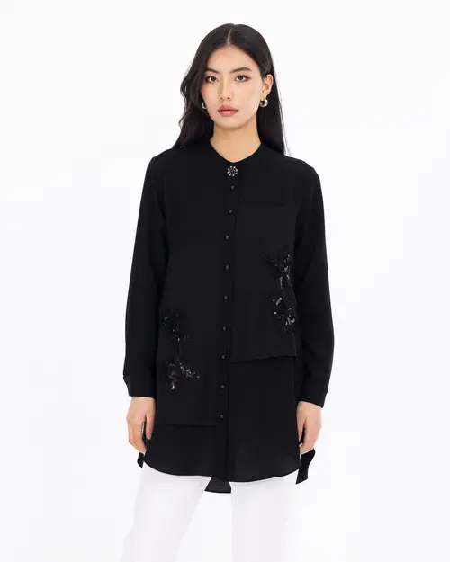 Payet ve nakışla detaylandıran tunik, inci düğmleriyle dikkat çekiyor. Şık okazyonlarda tercih edebileceğiniz tuniği, klasik pantolonlarınız ve topuklu ayakkabılarınızla tamamlayabilirsiniz.