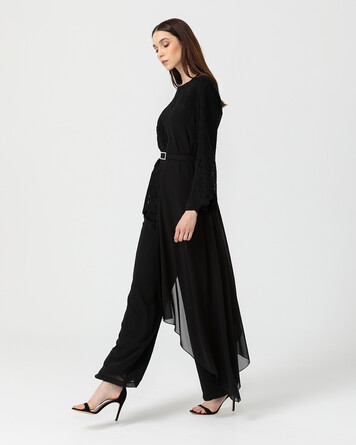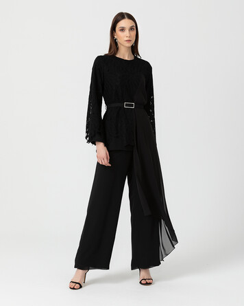 Dantel detaylar ve asimetrik tül formu ile sıradan görünümlere meydan okuyan tunik, şıklık yarışında yerini alıyor. Tuniği bol paça siyah pantolonlar ile kombinleyerek tek parça tulum havasını yansıtabilirsiniz.