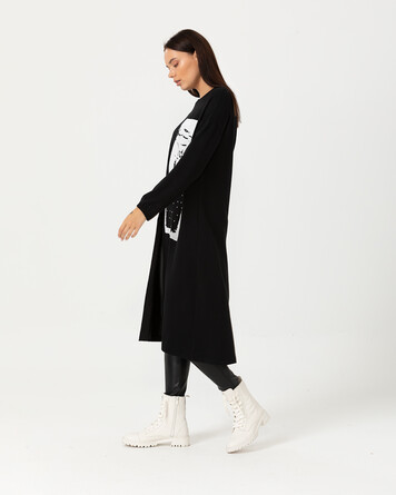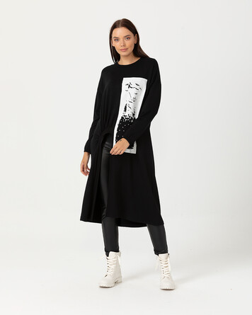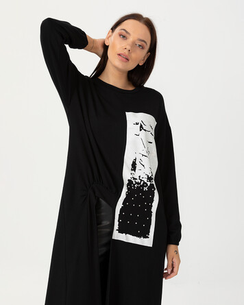 Oversize formu ile spor-şık bir görünüm yaratan tunik, baskısı ile de dikkat çekiyor. Tuniği, ofisten hafta sonuna birçok stili tamamlamak için kullanabilirsiniz.