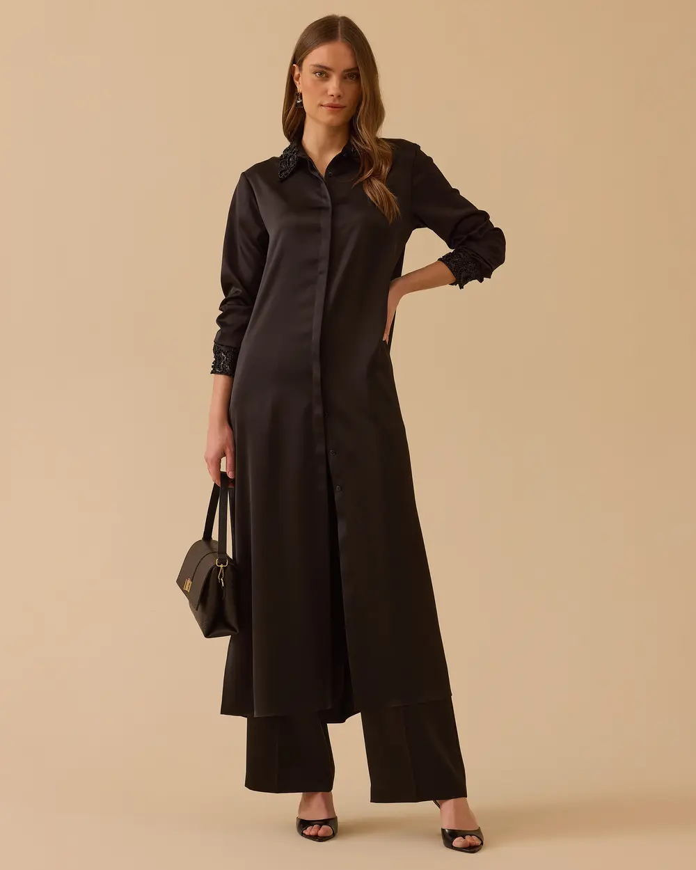 - boncuk detaylı saten tunik